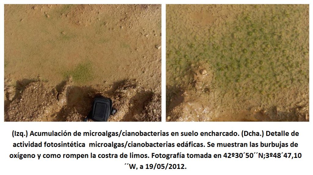 Las algas se pueden observar en los charcos donde se encuentran suspendidas en el agua, que tras evaporarse quedan conformando una costra verde visible. Esta costra constituye un incremento de la actividad biológica del suelo, ya que las algas quedan adheridas a las partículas minerales que conforman el suelo, conformando agregados que dotan de mayor estructura al suelo y de una mayor actividad biológica.