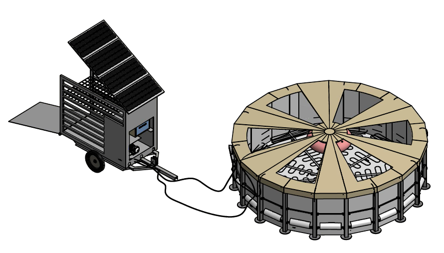 En este remolque se recogen los distintos elementos que componen el módulo: depósito, brazos de aireación, sistema de control y monitorización. El siguiente paso a realizar es el cableado de los cuadros de control, bombas de aireación, placas fotovoltaicas y demás dispositivos que realizará el equipo de la Universidad de Valladolid.