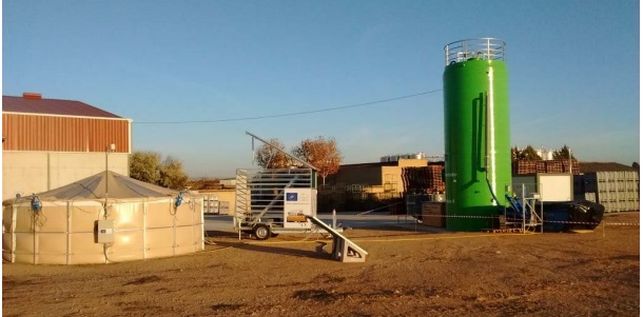 Instalación del prototipo con sus dos módulos de pretratamiento de residuos (derecha) y de producción de biomejorador (izquierda) en Bodegas Fontana (Cuenca)