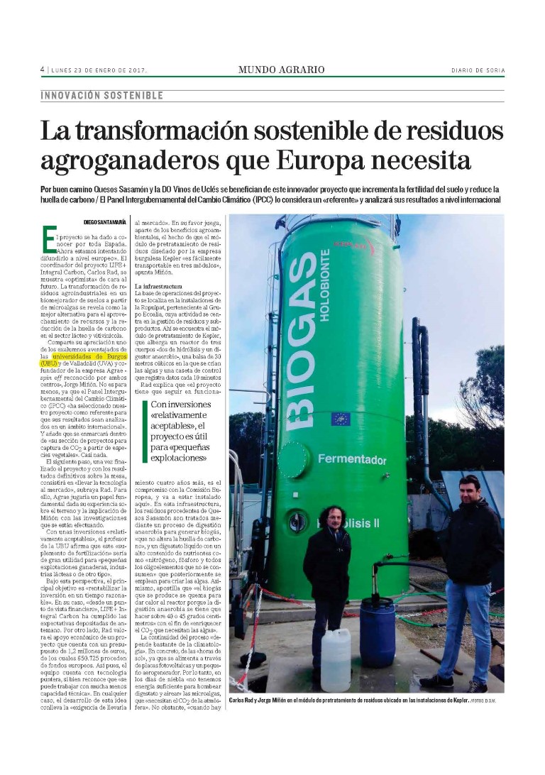El coordinador del proyecto LIFE+ Integral Carbon, Carlos Rad, se muestra «optimista» de cara al futuro. La transformación de residuos agroindustriales en un biomejorador de suelos a partir de microalgas se revela como la mejor alternativa para el aprovechamiento de recursos y la reducción de la huella de carbono en el sector lácteo y vitivinícola.