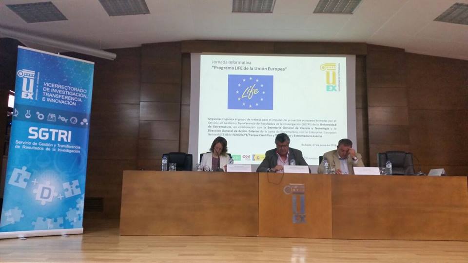 El pasado 17 de junio de 2016 tuvo lugar en el salón de actos del antiguo Rectorado de la UEx (Edificio Remón Camacho del Campus Universitario de Badajoz), la Jornada Informativa sobre el Programa LIFE de la Unión Europea, organizada por el Servicio de Gestión y Transferencia de Resultados de la Investigación (SGTRI) de la Universidad de Extremadura, en colaboración con la Secretaría General de Ciencia y Tecnología y la Dirección General de Acción Exterior de la Junta de Extremadura, con la Enterprise European Network (EEN) de FUNDECYT/Parque Científico y Tecnológico y Extremadura Avante.