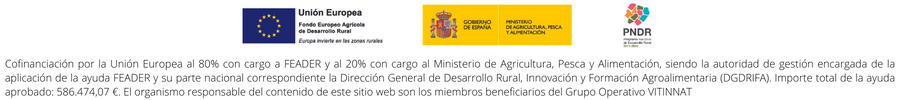 Cofinanciación por la Unión Europea al 80% con cargo a Fondo Europeo Agrícola de Desarrollo Rural y al 20% con cargo al Ministerio de Agricultura, Pesca y Alimentación, siendo la autoridad de gestión encargada de la aplicación de la ayuda FEADER y su parte nacional correspondiente la Dirección General de Desarrollo Rural, Innovación y Formación Agroalimentaria (DGDRIFA). Importe total de la ayuda aprobado: 586.474,07 €. El organismo responsable del contenido de este sitio web son los miembros beneficiarios del Grupo Operativo VITINNAT