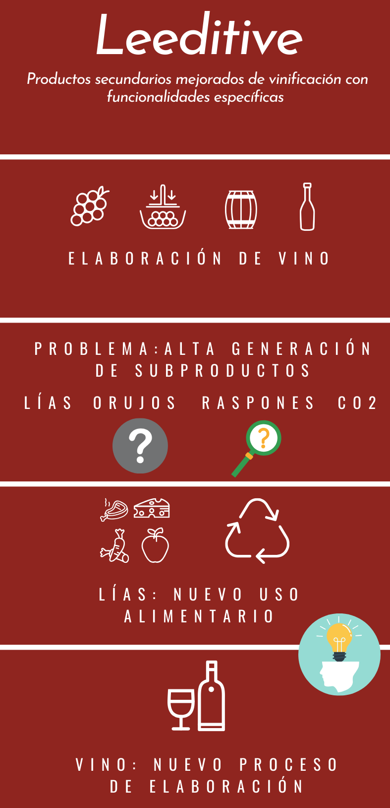 El Proyecto Leeditive “Productos secundarios mejorados de vinificación con funcionalidades específicas” presenta como principal innovación el desarrollo de un nuevo uso alimentario procedente del aprovechamiento de uno de los subproductos de las bodegas con menos utilidad: las lías.