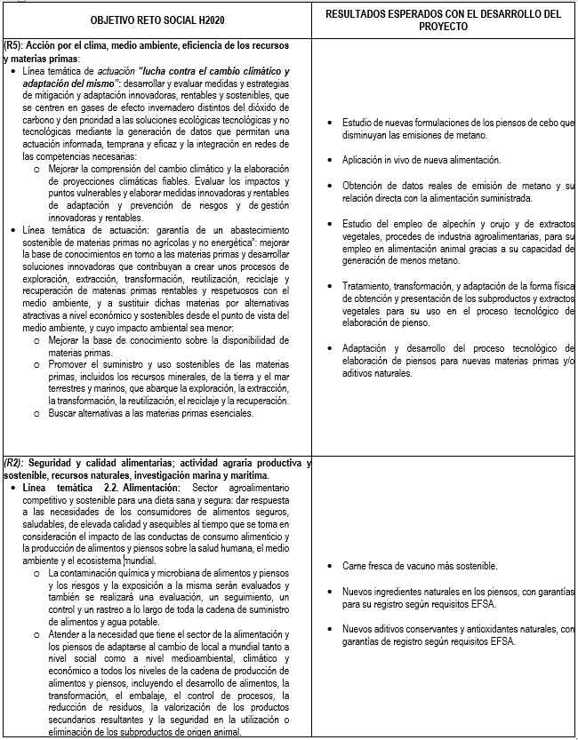 Por todo ello, se plantea obtener una información contrastada sobre los efectos, mecanismos de acción y dosis óptimas realizados en diferentes condiciones productivas, para identificar claramente en qué condiciones pueden ser eficaces, lo que conlleva determinar y estandarizar la concentración del componente o componentes activos, que deben ser estables para su almacenamiento y administración en condiciones prácticas de alimentación y ejercer un efecto persistente durante su administración a los animales, asegurándose la total inocuidad de estos compuestos o de sus metabolitos para los animales, los consumidores y el medio ambiente y, por ello, también hay que comprobar que los compuestos o sus metabolitos no afecten negativamente a la calidad de los productos animales. De esta forma, se espera desarrollar una alimentación para el ganado vacuno de carne más sostenible gracias a la generación de menos metano en el rumen de los animales, consiguiendo bajar las emisiones de GEI.
