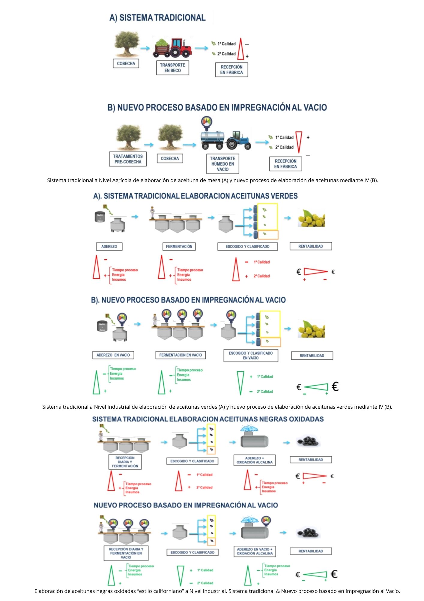 Esta técnica no solo busca frenar los procesos naturales de oxidación, sino también se espera reducir los recursos empleados para la elaboración industrial, incrementar el porcentaje final de aceitunas de primera calidad y reducir volumen total de residuos generados en la elaboración de aceitunas de mesa de diferentes estilos.