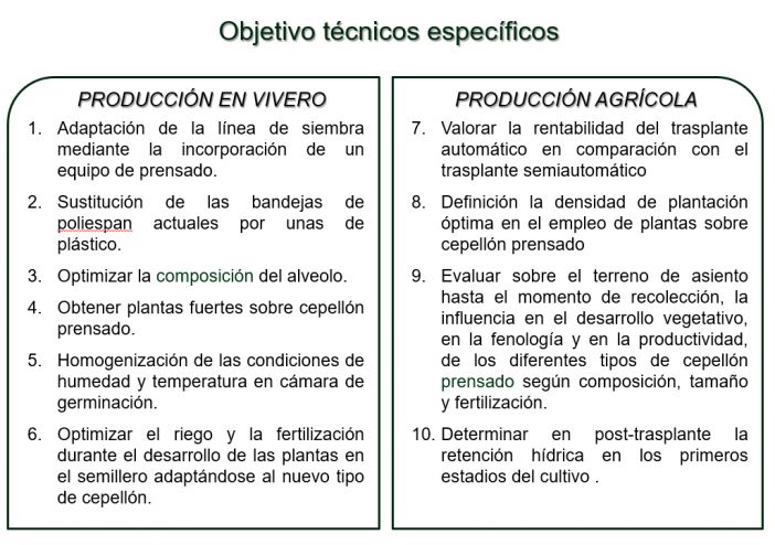 Este proyecto tiene como objetivo principal desarrollar un sistema de producción en vivero de hortícolas para la obtención de plantas sobre cepellón prensado, permitiendo así el trasplante automático en el terreno de asiento y validar el vigor, la resistencia y productividad de las mismas en campo.