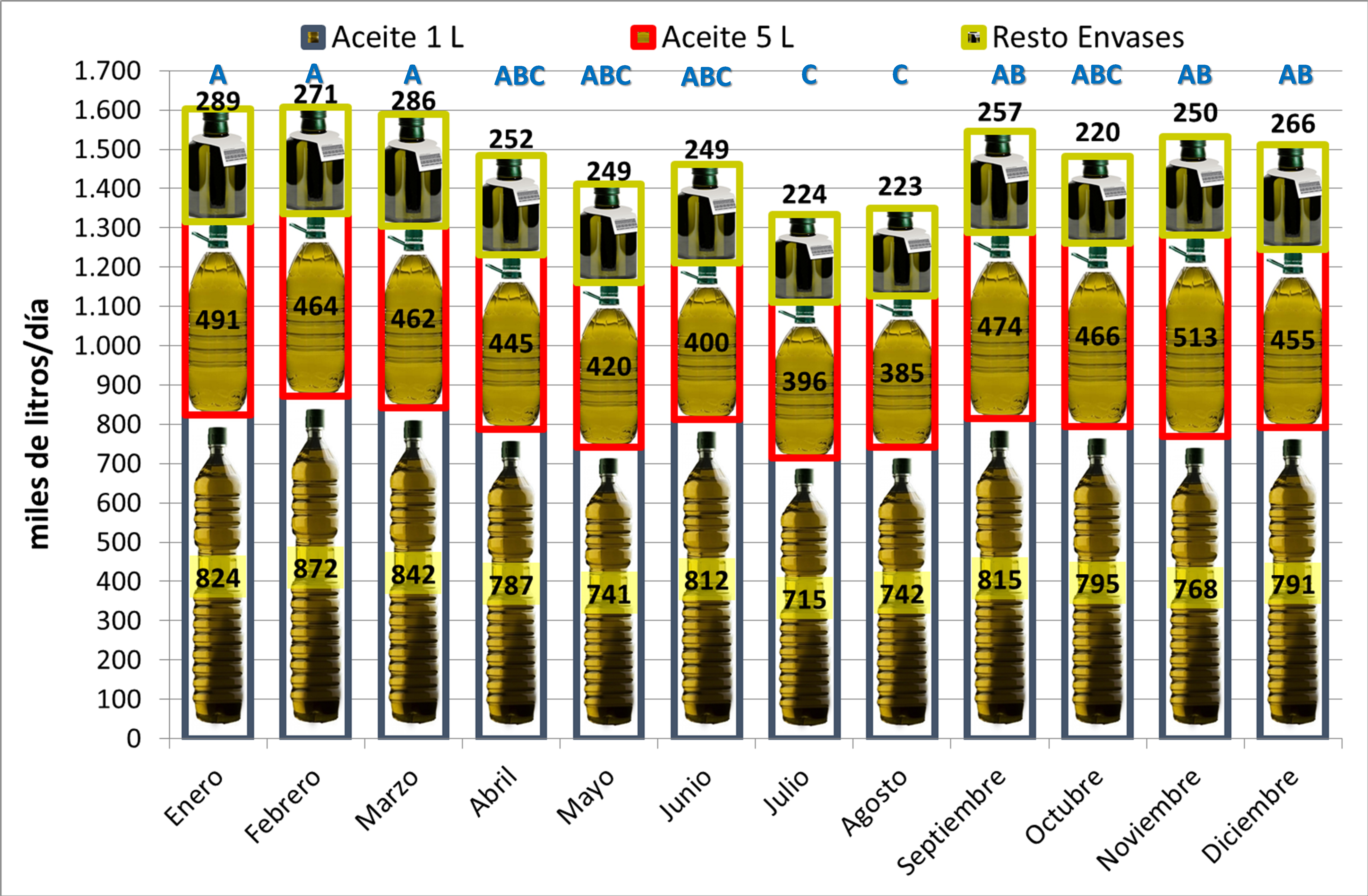 Figura 1. Compra por meses (t/día) de aceites y grasas vegetales en formatos de 1 L, 5 L y “Resto de Envases” en los Hogares Españoles. Elaboración propia a partir de datos del MAPAMA. Letras minúsculas diferentes indican diferencias significativas para significancia p<0,050 según el test de Duncan para igual categoría de aceite-grasa y mayúscula para el total de grasas vegetales. La ausencia de letra indica que no se registró efecto significativo entre los distintos tratamientos por ANOVA.