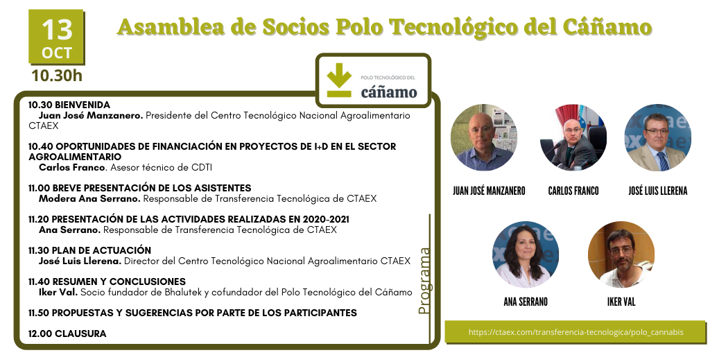 El día 13 de octubre de 2021 se celebró la primera asamblea de socios del Polo Tecnológico del Cáñamo, donde se han repasado las actividades llevadas a cabo en la pasada anualidad y el plan de acción para los próximo meses.