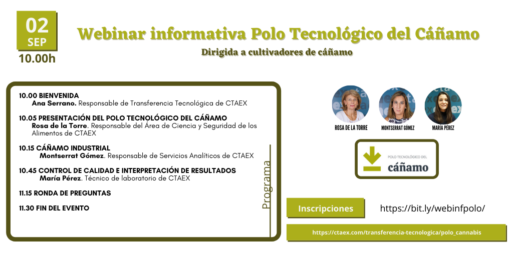 El jueves, 2 de septiembre de 2021, a las 10 horas, se realizó un webinar informativo dirigido a cultivadores del cáñamo donde se informó sobre control de calidad e interpretación de los resultados, sistemas de cultivo y normativa europea.