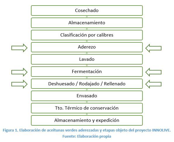 El objetivo principal del proyecto INNOLIVE será mejorar la competitividad de fábricas de aceituna de mesa mediante la optimización de su proceso de elaboración a tiempo real y distancia. El diagrama de flujo que sigue muestra las etapas que comprende el proceso de elaboración de aceituna de mesa verde aderezada o estilo español, como producto objetivo en INNOLIVE. Sobre éste, se han señalado mediante flechas aquellas etapas que, por considerarse críticas desde los rendimientos de producción y la calidad del producto final, serán objeto de tecnificación en el Proyecto INNOLIVE.