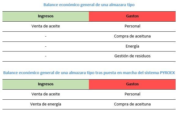 A modo de ejemplo, sirva el caso particular de una almazara tipo donde uno podría esperar los siguientes balances antes y tras la implementación de la tecnología PYROEX: