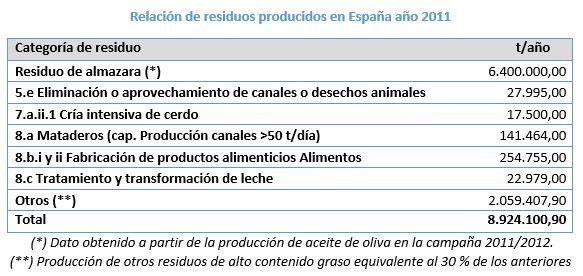 Sirva como referencia la tabla que sigue para ilustrar la importancia de los residuos de almazara en el panorama nacional.